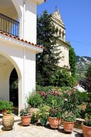 Potten & planten spelen in mediterrane landen altijd een belangrijke rol bij het verfraaien van de tuin. In het klooster van Agios Gerasimos op Kefalonia, Griekenland, werden er veel gebruikt.