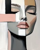 Abstract close-up portret van een serene vrouw in matte poederachtige pastel tinten met grijs, zwart en goud accent op een canvas textuur.