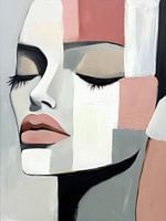 Abstract close-up portret van een serene vrouw in matte poederachtige pastel tinten met grijs, zwart, taupe en roze accenten op een ruwe textuur.