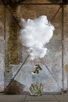 Een fotowerk met een stoere uitstraling. Wolk hangend in verlaten fabriek met kiezels eronder hangend, De steen onderin zegt het al - ruwe power.