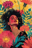 Portret van een vrouw omring door prachtige bloemen, krachtig en kleurrijk. Mix van pop art en vector. Rood roze bloemen op een diepgele achtergrond en aqua groene bladeren. De vrouw heeft een mooie zwarte jurk gelijk aan de keluer van haar haar. Passend bij diverse stijlen en trends, waaronder portret vrouw, pop art, kleurrijk, bloemen. Artist: Bianca ter Riet