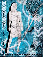 Deze monotype is gemaakt met een gelliplate. Een uniek en eenmalig werk, er kan maar 1 afdruk worden gemaakt van je ontwerp. Door de druktechniek en het gebruikte papier ontstaan er allerlei structuren en effecten. Deze powergirl staat haar mannetje in stoer turquoise.