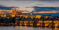 Deze foto van de beroemde Karelsbrug en Prague Castle is genomen met een lange sluitertijd vlak na zonsondergang en vlak voor het zogenoemde blauwe uur