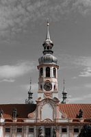 Toren in Praag met de kleur oranje naar voren gehaald en rest grijswaarden.