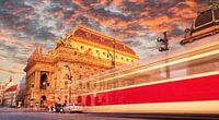 Stadsbeeld van Praag rond zonsondergang met voorbij rijdende tram.