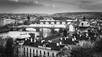 Een zwart-wit foto met uitzicht vanaf Letenske Sady over de stad Praag met de rivier de Moldau en de beroemde Karelsbrug, in de Tsjechische Republiek.