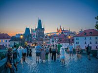 s Avonds, nadat de lichten zijn ontstoken, heb je vanaf de Karelsbrug een fantastisch uitzicht op de Kleine Stad van Praag met de Kleine Stadstoren, de Hradcany Heuvel en de Praagse Burcht.
