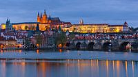 Het beroemde en klassieke uitzicht op de Praagse Burcht en de Karelsbrug. Genomen na zonsondergang met blik over de Vltava rivier.