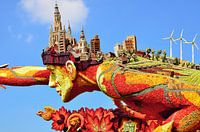 Praalwagen van man met uitgestrekte arm en stadsgezicht op hoofd en platteland op rug; bloemencorso Zundert, Noord-Brabant