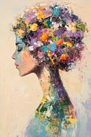 Een silhouet bloeit in een harmonieuze melange van kleuren, bekroond door een levendige bloemenzee. De delicate bloesems in levendige paarse en gele tinten dansen letterlijk in contrast met de zachte huidskleur. Een gevoel van levendigheid en creativiteit stroomt door de afbeelding, waardoor de grenzen tussen mens en natuur vervagen.