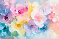 Een delicaat kleurenspel ontvouwt zich in deze bloemenfantasie, waar zachte pasteltinten harmonieus samensmelten. De bloeiende vormen lijken te dansen, terwijl licht en schaduw de bloemblaadjes tot leven brengen. Een frisse lentebries waait door de compositie, betovert de zintuigen en nodigt je uit om te dromen.