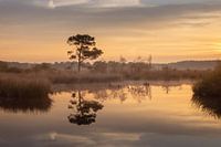Foto van een mooie boom bij zonsopgang in het Drentse natuurgebied het Dwingelderveld. Geniet van de rust met deze foto in je interieur.