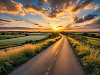Uitgestrekte weilanden strekken zich uit tot aan de horizon, waar het zachte licht van de opkomende zon de lucht in warme tinten kleurt. De groene velden worden doorsneden door een rustige sloot, die als een natuurlijke grens fungeert tussen de akkers. Het water reflecteert de gouden gloed van de zon, terwijl het een rustige stroom volgt, omgeven door riet en wilde bloemen die langs de oevers wiegen in de wind.