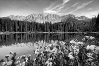 Het meer van Carezza in Zuid-Tirol in Italië met mooie bergbloemen op de voorgrond.