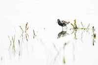 Een kemphaan in het voorjaar op de ondergelopen Friese weilanden, op zoek naar voedsel.