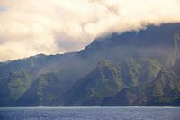 Het ene prachtige uitzicht na het andere tijdens een tocht langs de Nā Pali-kust op het eiland Kaua'i in Hawai'i, VS. De ochtendwolken wegen zwaar op de bergtoppen.