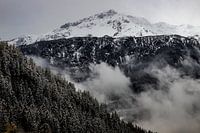 Sneeuw in de bergen in Zwitserland. Een landschap met verschillende laagjes, besneeuwde bergtoppen, een donker stukje rots, wolken die als mist uit de bergen opstijgen en een laag bomen. Een mooie winterse foto die perfect als kunstwerk bij jou aan de muur past.