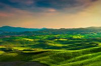 Prachtig licht op het Toscaanse landschap. Glooiende heuvels en tarwevelden bij zonsondergang. Volterra, Toscane, Italië