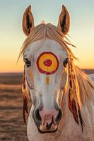 Een stralend paard met sneeuwwitte vacht valt op in het zachte licht van de schemering. Een levendig rood en geel patroon op zijn voorhoofd geeft het een mystiek karakter. Lange, vloeiende manen en zachte ogen trekken de aandacht van de kijker, terwijl de omringende uitgestrektheid van het land een gevoel van vrijheid en avontuur uitstraalt.