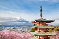 Een majestueus schouwspel opent zich wanneer de heilige berg van Japan, Mount Fuji-san, zijn besneeuwde top verheft boven de betoverende achtergrond van bloeiende kersenbomen. De Chureito Pagode troont voor dit adembenemende panorama als een stille bewaker van schoonheid.