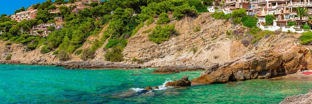 Prachtig uitzicht op de kustlijn bij Santa Ponsa met mediterrane huizen, Balearen, Spanje Middellandse Zee, Mallorca, Balearen, Balearen, Middellandse Zee, Spanje