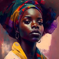 "Op het schilderij zien we een vrouw van kleur met haar hoofd opgeheven en haar ogen iets neergeslagen, waardoor ze een kalm en zelfverzekerd gevoel uitstraalt. Haar blik is gericht op de toeschouwer, wat een intieme en betekenisvolle verbinding creëert. De prachtige, veelkleurige hoofdband die ze draagt, benadrukt haar gelaatstrekken en geeft haar uitstraling nog meer kracht. De compositie en kleurenkeuze van het kunstwerk dragen bij aan het gevoel van sereniteit en zelfvertrouwen dat het uitstraalt."