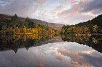 Ervaar de adembenemende schoonheid van een Schotse ochtend met deze prachtige foto die is genomen in het pittoreske Glencoe. De dageraad baadt het landschap in een fascinerend lichtspel van kleurrijke wolken die perfect worden weerspiegeld in het gladde water. De herfstkleurige bomen langs de oever geven de foto een warme, uitnodigende…