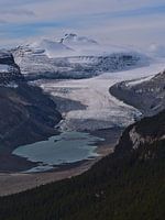 Landschapsfoto van de Saskatchewan-gletsjer, onderdeel van het Columbia-ijsveld, in de Rocky Mountains in de herfst met besneeuwde bergen, een gletsjermeer en een dicht naaldbos op de voorgrond in Banff National Park, Alberta, Canada.
