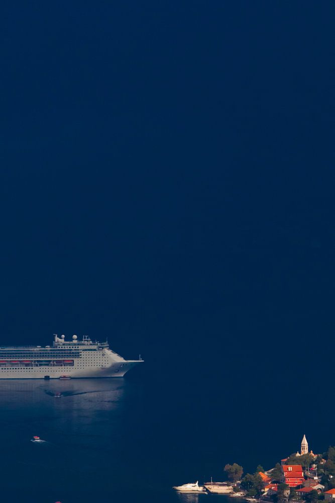 Prachtige cruiseschepen (een zeilend) liggen ver onder het donkerblauw in de buurt van de stad met rode daken, Montenegro Kotor