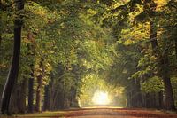 De oprijlaan naar kasteel Moersbergen in Doorn in een prachtige gouden herfstgloed. Nationaal park Utrechtse Heuvelrug