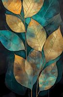 Een abstracte creatie van bladeren weergegeven in groene en oranje, natuurlijke kleuren.
