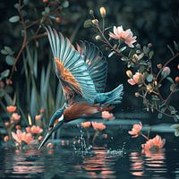 Magische afbeelding van een ijsvogel in een sprookjesachtige omgeving. De ijsvogel beschikt over mooie details en wordt omringd door roze bloemen en water.