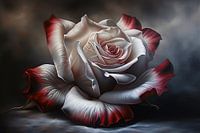 Dit prachtige moderne schilderij toont een realistische roos met betoverende details. De bloembladen zijn kunstig weergegeven met subtiele kleurovergangen van wit naar rood, wat het geheel een levensechte uitstraling geeft. De achtergrond heeft een mooie mix van donkere en lichte tinten, waardoor de roos extra naar voren komt. Dit…
