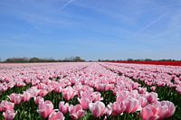 Het bewonderen van de bollenvelden op onze derde stop langs de lokale weg N9 in Noord-Holland, Nederland. De velden zijn hier enorm groot en tot aan de horizon zijn verschillende rode en roze tulpen te zien. Wij vonden deze roze en witte erg mooi.