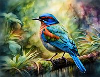 Stel je een vogel voor die de levendigheid van het regenwoud belichaamt. Maak kennis met de Gurney's Pitta, een middelgroot wonder met een verenkleed dat niet onderdoet voor glas-in-lood. Mannetjes hebben een oogverblindende paarsblauwe kroon, een opvallende gele halve kraag en opvallende zwartgele onderdelen. Vrouwtjes, niet minder prachtig, hebben een lichtgele kroon en een contrasterende borst met zwarte strepen.