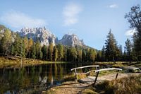 De weerspiegeling van de bomen en de bergen aan de rand van dit prachtige rustige bergmeer tijdens een mooie herfstdag met blauwe lucht. Een sfeervol beeld dat rust uitstraalt. Ook horizontaal te verkrijgen.