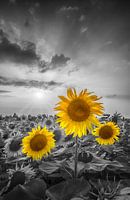 Groot zonnebloemveld in zwart-wit met oplichtende gele bloesems in de ondergaande zon. Prachtig landschap geschoten in de avonduren.