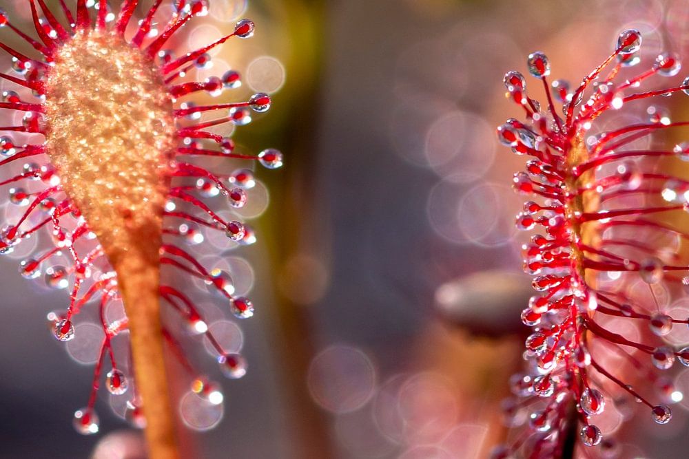 Zo mooi om te zien deze kleine blaadjes van de zonnedauw. Het is een vleesetend plantje van ongeveer 5 cm hoog. De kleverige druppels aan de randen vangen insecten en sluiten daarna om de prooi te verteren. Deze foto is gemaakt in de Oisterwijkse bossen en vennen/ Noord-Brabant/ n