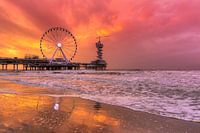 Prachtig avondrood bij de Pier van Scheveningen en een mooie reflectie van de Pier in het natte zand van het strand
