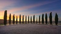 De cirkel van cipressen van San Quirico d'Orcia in Val d'Orcia, tijdens een kleurrijke zonsondergang in de herfst. Toscane, Italië
