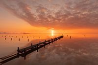 Foto van een prachtige zonsondergang aan het IJsselmeer. Op de foto zie je een steiger en paaltjes waar je je boot aan vast kunt leggen in de zomer. De zon gaat prachtig oranje onder. De wolken, zon en paaltjes reflecteren in het gladde water. De foto is gemaakt bij Hindeloopen, januari 2023. (Friesland, Nederland).