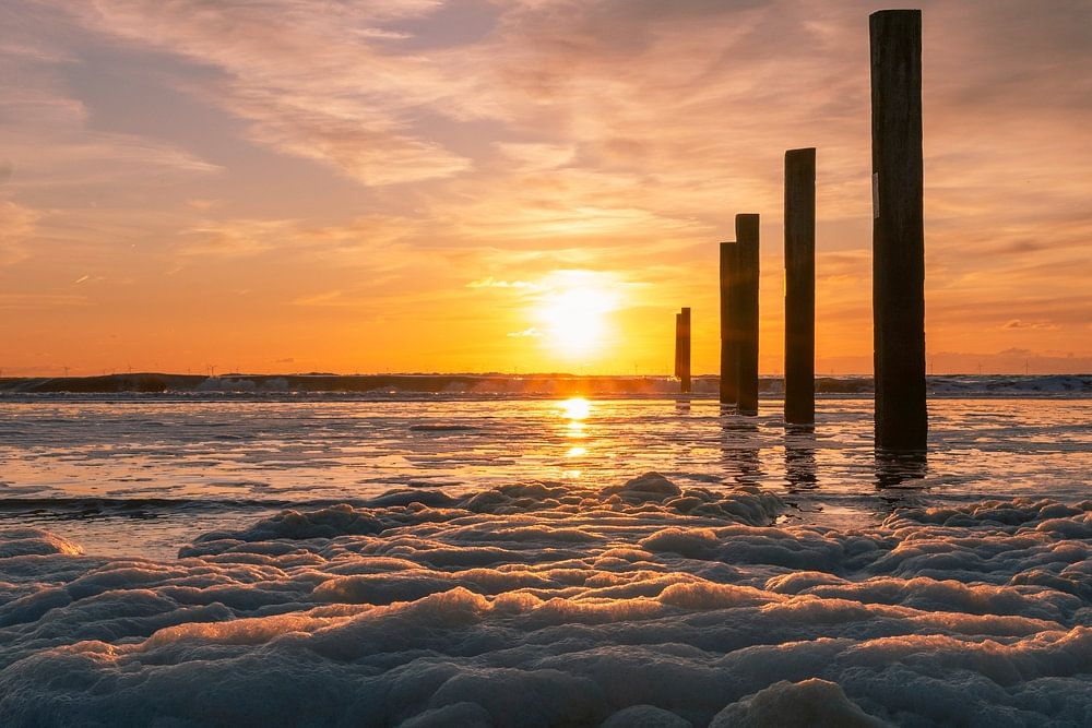 De zon is bijna onder, de lucht kleurt geel en oranje boven de Noordzee. Op het strand bij Noordwijkerhout ligt aan de vloedlijn een dikke laag zeeschuim die door het lage standpunt waar van uit de foto is gemaakt, goed te zien is.