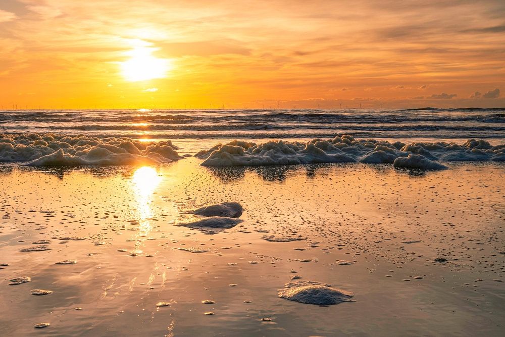 De zon is bijna onder, de lucht kleurt geel en oranje boven de Noordzee. Op het strand bij Noordwijkerhout ligt aan de vloedlijn een dikke laag zeeschuim die door het lage standpunt waar van uit de foto is gemaakt, goed te zien is.