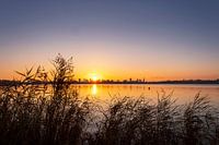 Prachtige zonsondergang over de Kralingse Plas met kleurrijke hemel weerspiegelt in de stille wateren van het meer in Rotterdam, Nederland.