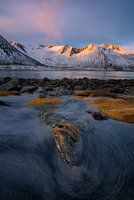 Zonsopkomst met mooie kleuren en het eerste licht op de besneeuwde bergen van Senja in Noorwegen.