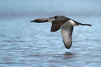 Black-throated Loon / Arctic Loon / Prachttaucher ( Gavia arctica ), in flight, flying close above water surface, side view, wildlife, Sweden.