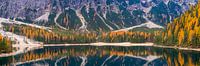 Een weids 3:1 panorama beeld van een rustige ochtend in de herfst met volop herfstkleuren van de Lariksbomen bij de Pragser Wildsee (Lago Braies), een pittoresk meer in de Dolomieten in Zuid-Tirol, Italië.