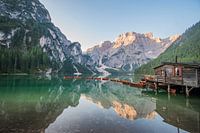 Pragser Wildsee (Lago di Braies) is een van de mooiste meren in de Dolomieten in Italië. Het meer is spiegelglad tijdens zonsopkomst en de roeibootjes liggen nog stil.