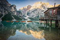 Het beroemde Lago di Braies ofwel Pragser Wildsee meer met groen water, een boothuisje en roeiboten in het kalme water met de weerspiegeling van de omliggende Dolomieten op een zomermorgen in Italië.
