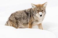 Prairiewolf staand in sneeuw met een paar sneeuwvlokken op zijn neus in Yellowstone national park.